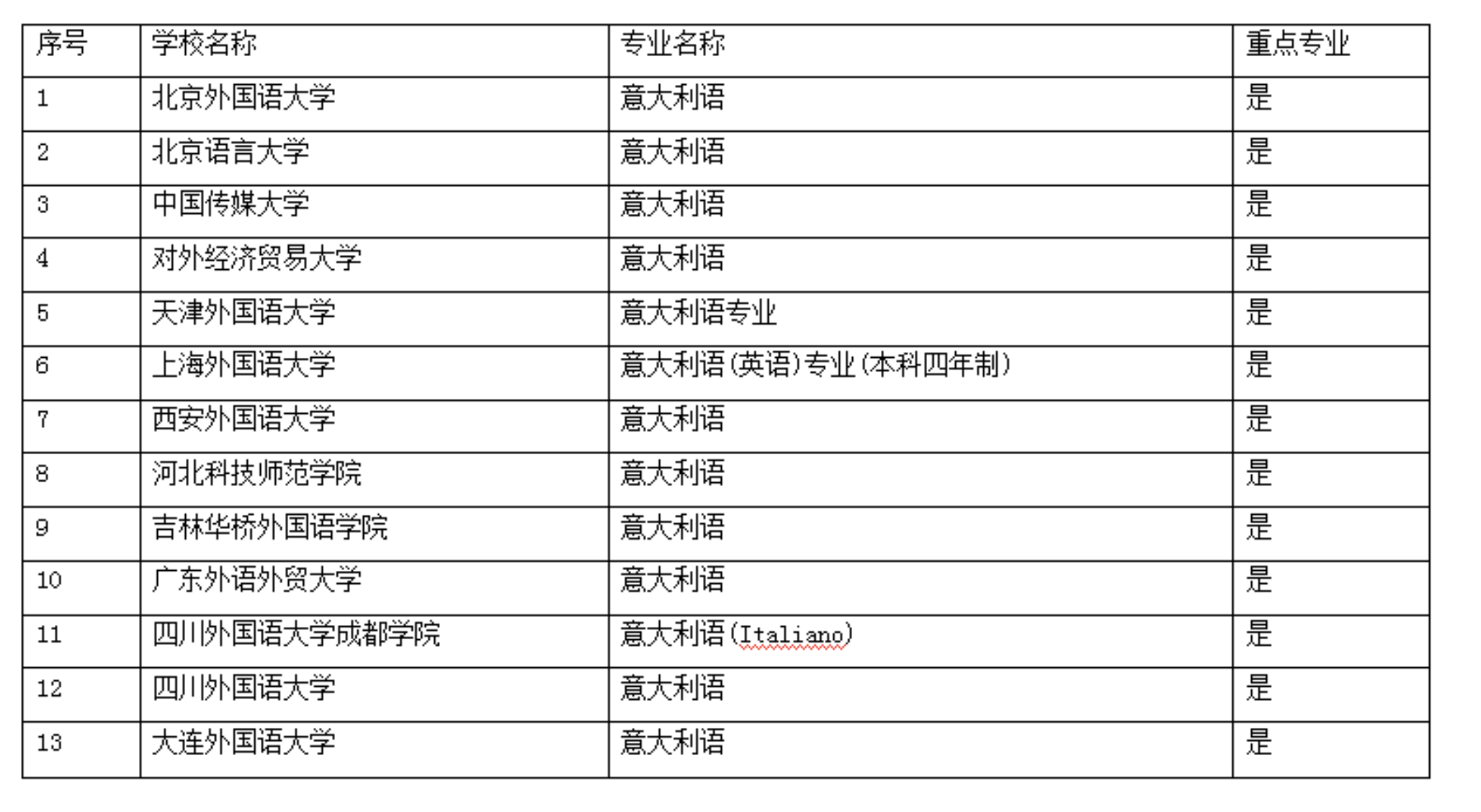 中国开设意大利语专业的院校名单(来源网络2018年资料)