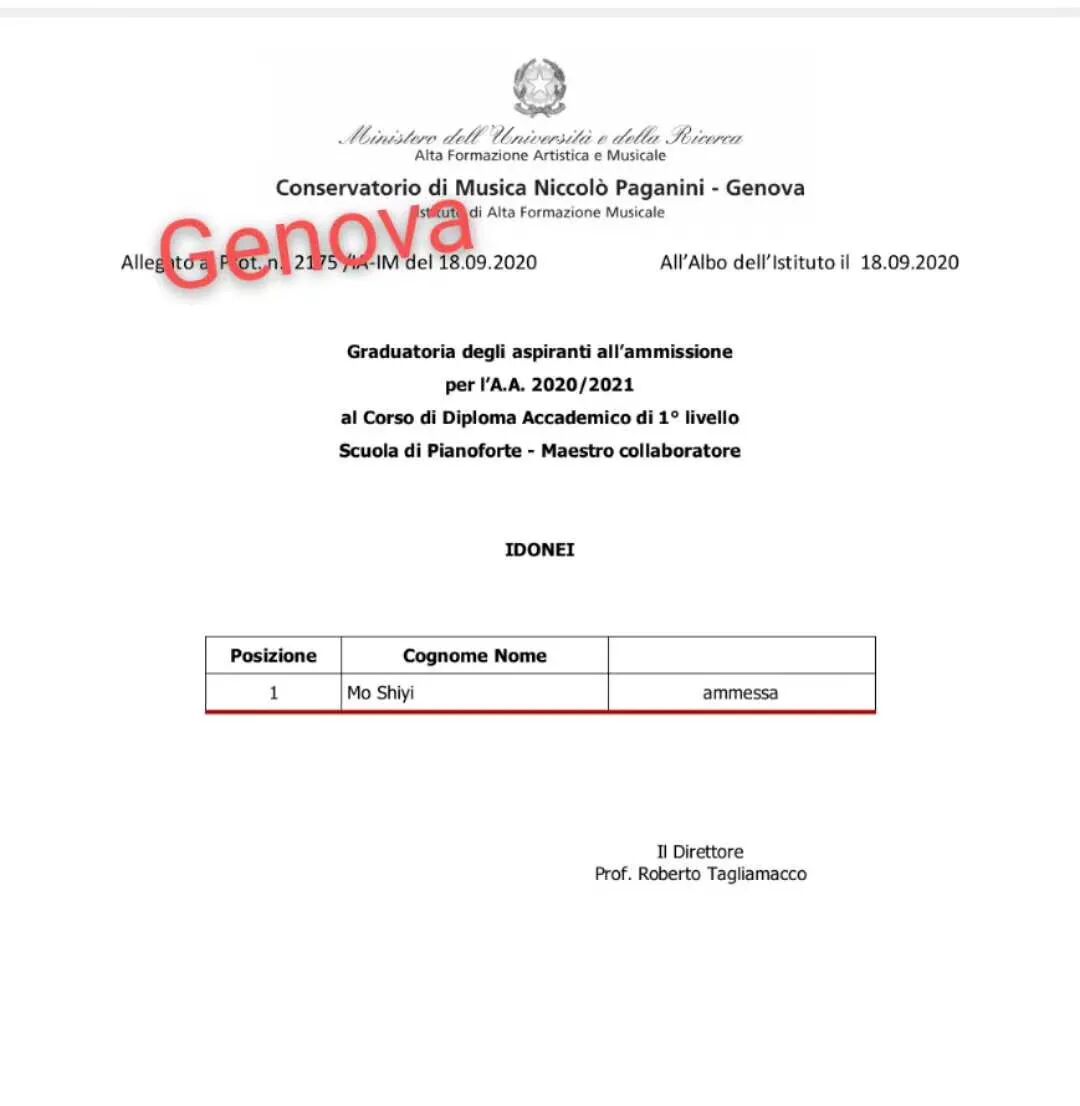 热那亚:(热那亚是我遇见唯一一个没考试就因为本科学校降本的学校)1、语言考试,只认cils B2,其他任何语言证书都不认。没有锡耶纳证书的外国人一律需要意大利语考试。未通过将没有资格进行专业考试。2、小三门现场考试。对题型有兴趣的可以私信咨询。3、专业现场考试,艺术指导先进考场试钢琴(一个雅马哈一个斯坦威),可以选择一个喜欢的琴来弹。