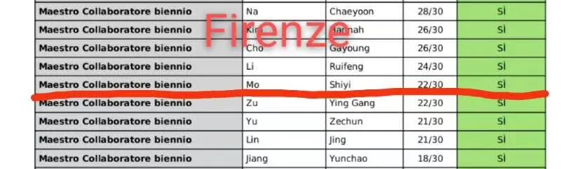 我是本科声乐专业soprano lirico,研究生今年考上佛罗伦萨音乐学院,novara音乐学院,Piacenza音乐学院 以及热那亚音乐学院(这个Genova……本身过了研究生的考试,但由于本科不是音乐学院,所有报考研究生的非音乐学院学生在还没考试之前就被集体降本)。