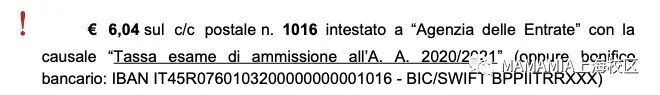 6.04通过 c/c postale n. 1016 intestato a “Agenzia delle Entrate” 转账原因为“Tassa esame di ammissione all’A. A. 2020/2021” (或者通过银行iban为 IT45R0760103200000000001016 - BIC/SWIFT BPPIITRRXXX来进行转账)