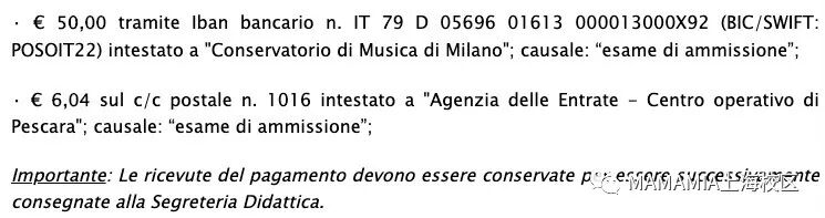 国际生不能在网上注册哦,但一定要参加预注册,敲重点:米兰音乐学院只接收预注册考生之后收到邮件之后等你到意大利就要去邮寄来支付费用咯: